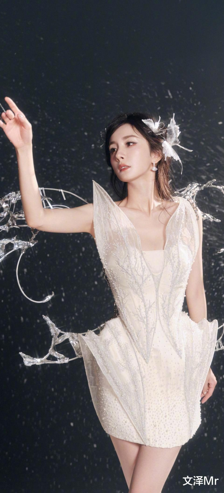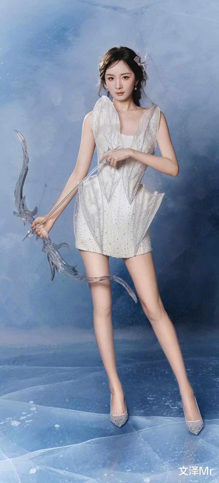 这张持弓造型图里,杨幂的身材优势被高定剪裁放大到极致。束腰包臀的版型精准勾勒出纤细腰肢,短款下摆大胆秀出笔直长腿,搭配 水晶高跟鞋,瞬间穿出 “人间九头身” 比例。吊灯耳饰与弓身光泽相互映衬,每一处配饰都在强化 “冰雪射手” 的英气感。